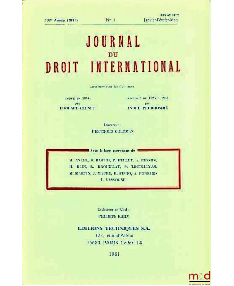 JOURNAL DU DROIT INTERNATIONAL, 108ème année (1981) n° 1 (janvier-février-mars)
