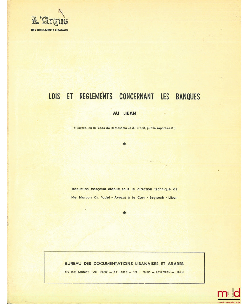 LOIS ET RÈGLEMENTS CONCERNANT LES BANQUES AU LIBAN, coll. L’Argus des documents libanais, traduction française sous la direction de Me. Maroun Kh....