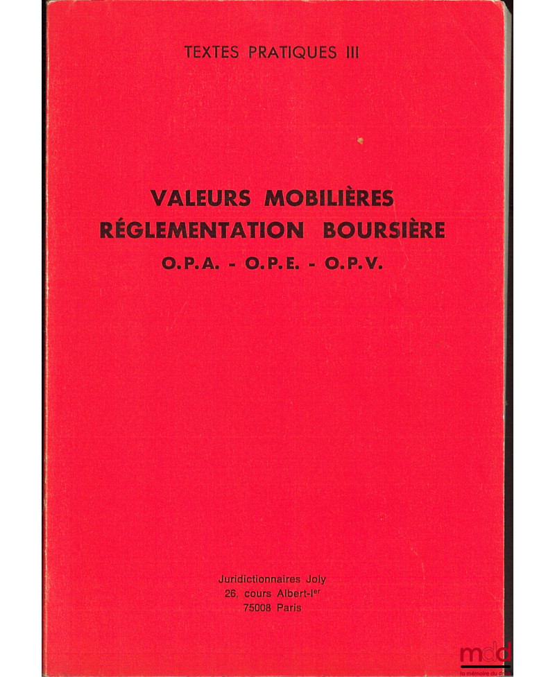 TEXTES PRATIQUE III : VALEURS MOBILIÈRES. RÉGLEMENTATION BOURSIÈRE - O.P.A - O.P.E. - O.P.V.