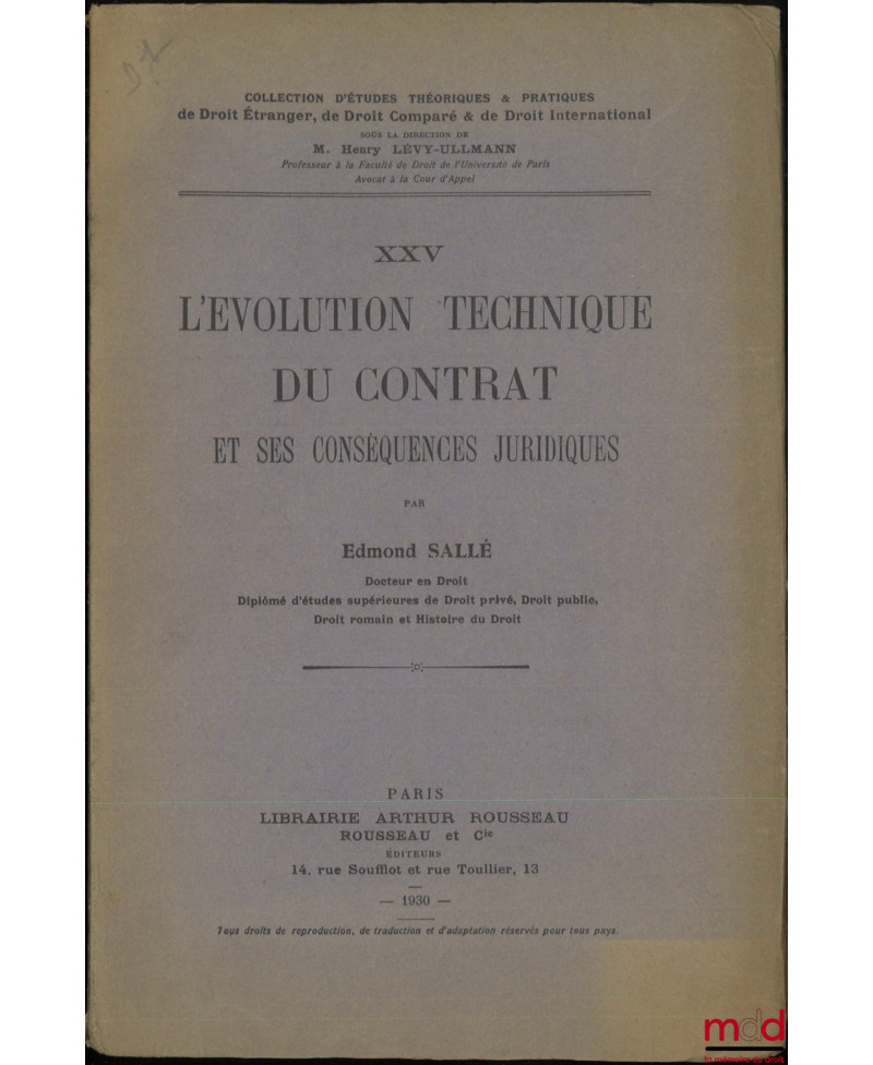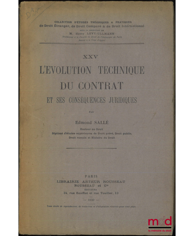 L’ÉVOLUTION TECHNIQUE DU CONTRAT ET SES CONSÉQUENCES JURIDIQUES, coll. d’études théoriques & pratiques de droit étranger, de droit comparé...