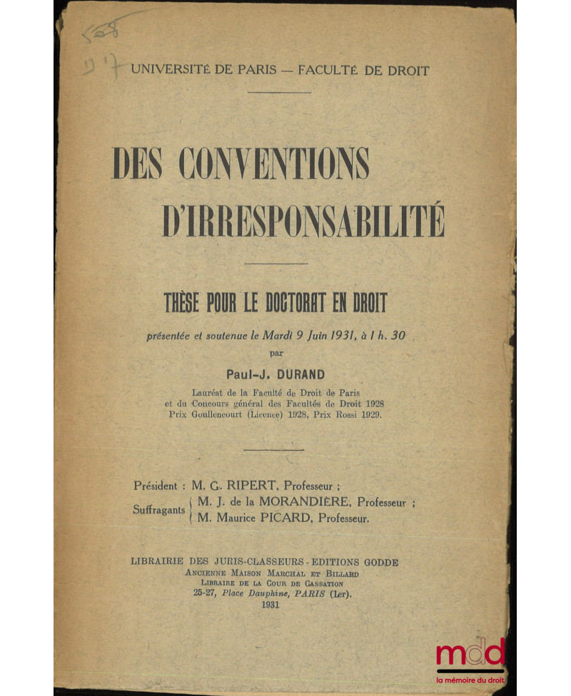LES CONVENTIONS D’IRRESPONSABILITÉ, Thèse (Président : M. G. Ripert ; Suffragants : M. J. de la Morandière, M. Maurice Picard), Université de...