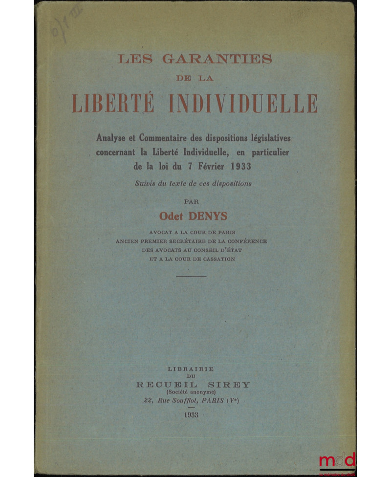 COMMENTAIRE DE LA LOI DU 7 FÉVRIER 1933 SUR LES GARANTIES DE LA LIBERTÉ INDIVIDUELLE