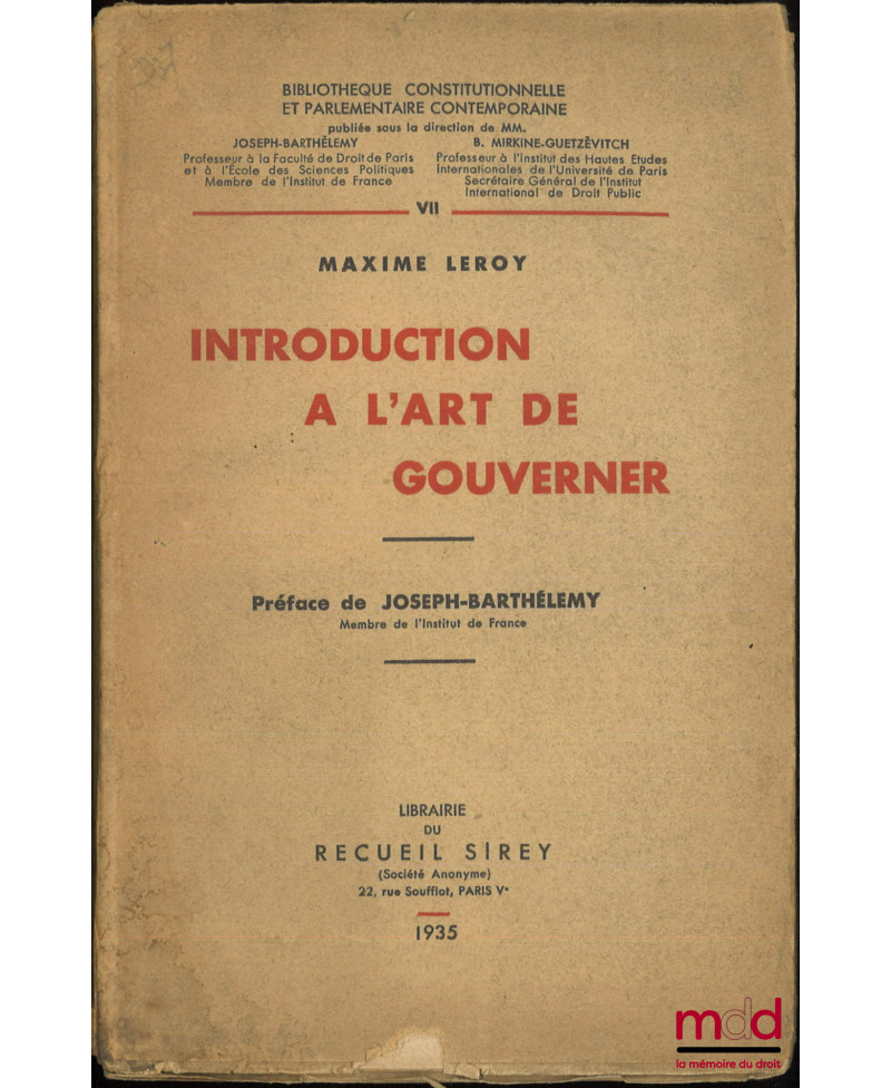 INTRODUCTION À L’ART DE GOUVERNER, Préface de Joseph Barthélemy, Bibl. constitutionnelle et parlementaire contemporaine t. VII