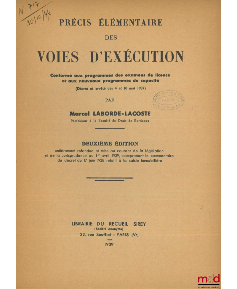PRÉCIS ÉLÉMENTAIRE DES VOIES D’EXÉCUTION, Conforme aux programmes des examens de licence et aux nouveaux programmes de capacité, (Décret et arrêté...
