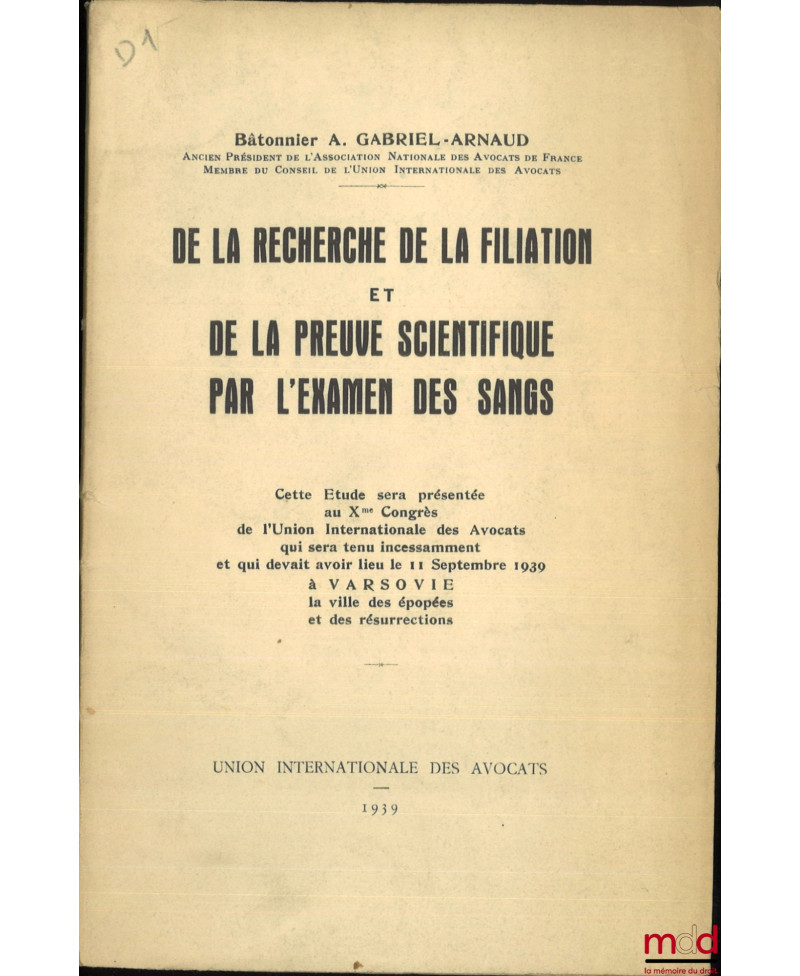 DE LA RECHERCHE DE LA FILIATION ET DE LA PREUVE SCIENTIFIQUE PAR L’EXAMEN DES SANGS