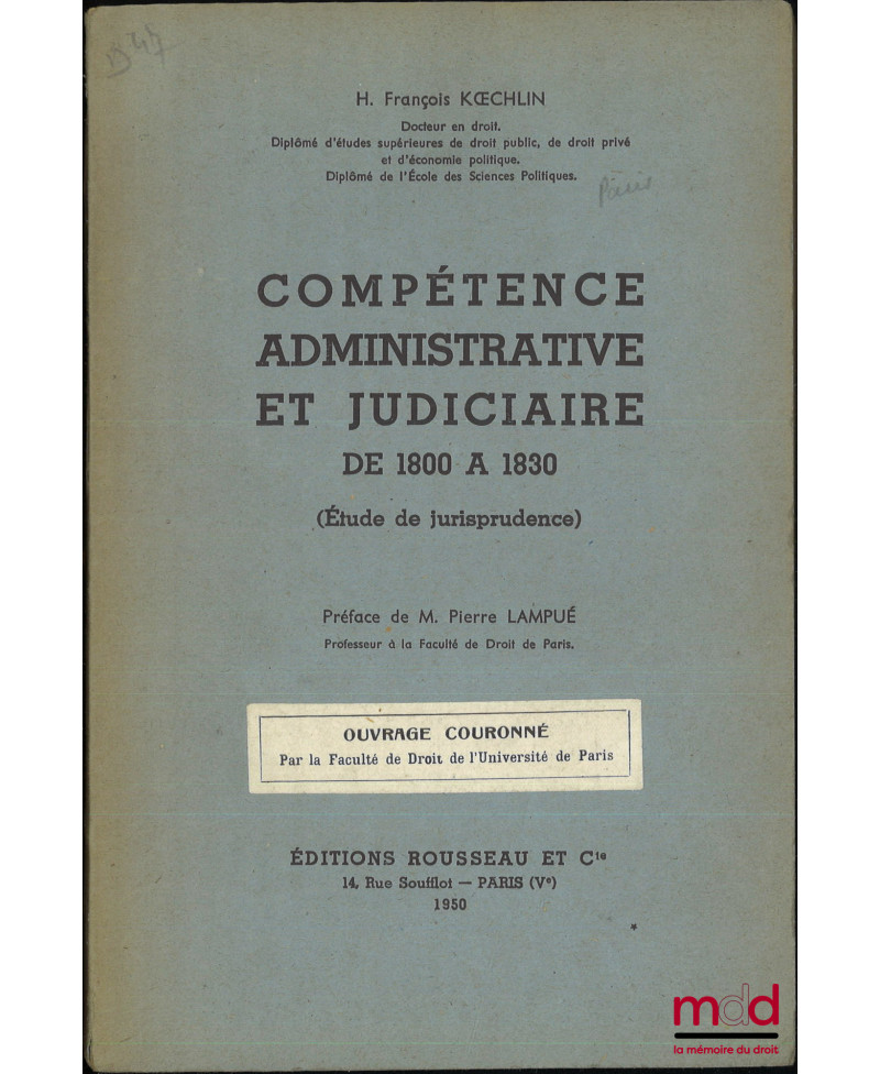 COMPÉTENCE ADMINISTRATIVE ET JUDICIAIRE DE 1800 À 1830 (Étude de jurisprudence), Préface de Pierre Lampué