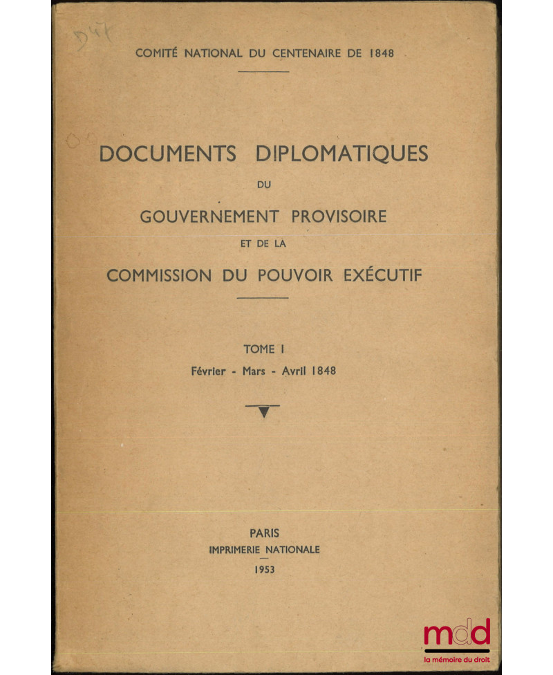 DOCUMENTS DIPLOMATIQUES DU GOUVERNEMENT PROVISOIRE ET DE LA COMMISSION DU POUVOIR EXÉCUTIF, t. I : Février - Mars - Avril 1848