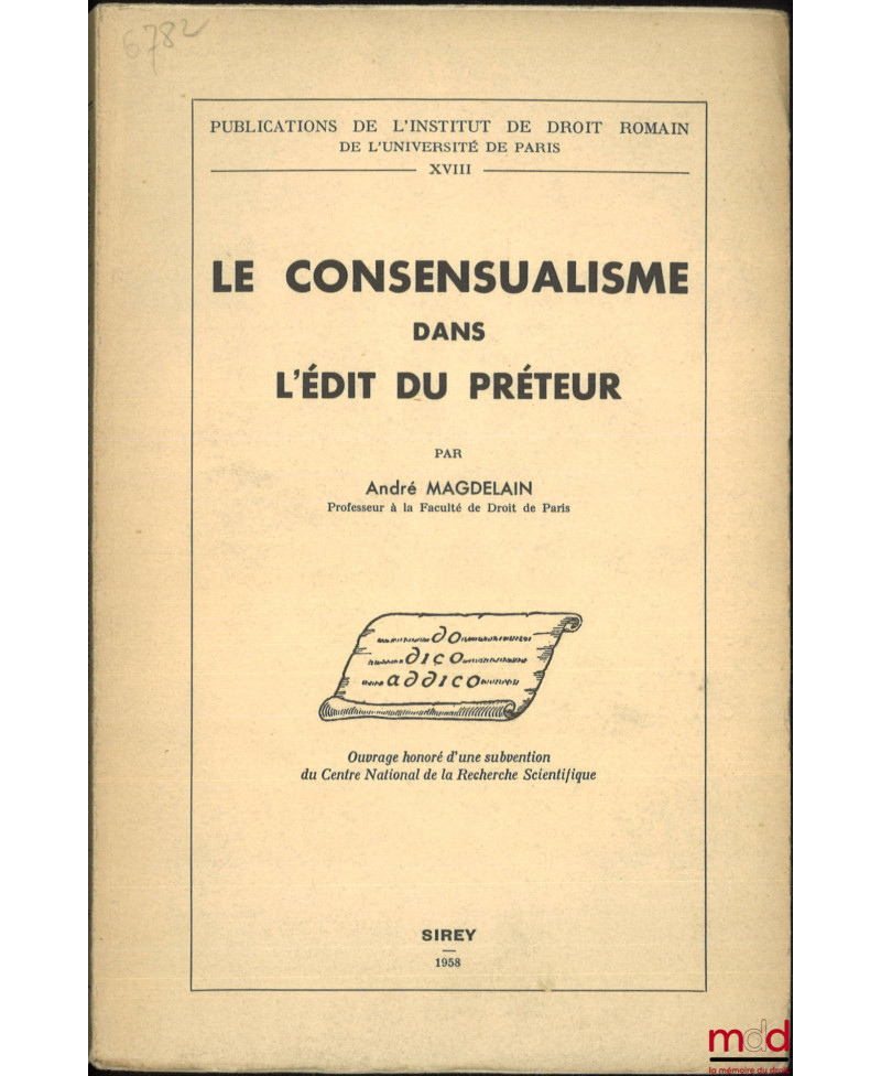 LE CONSENSUALISME DANS L’ÉDIT DU PRÉTEUR, Publications de l’Institut de droit romain de l’Université de Paris, t. XVIII