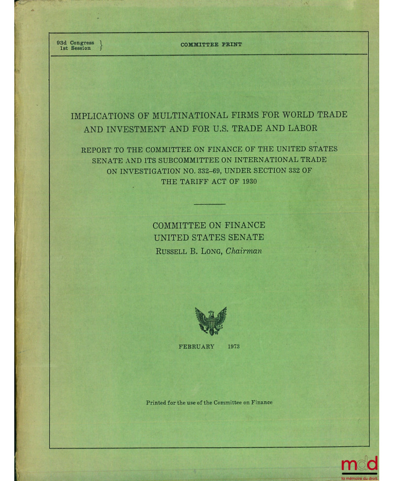 IMPLICATIONS OF MULTINATIONAL FIRMS FOR WORLD TRADE AND INVESTMENT AND FOR U.S. TRADE AND LABOR. Report To the Committee on Finance of the United...