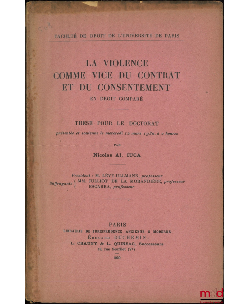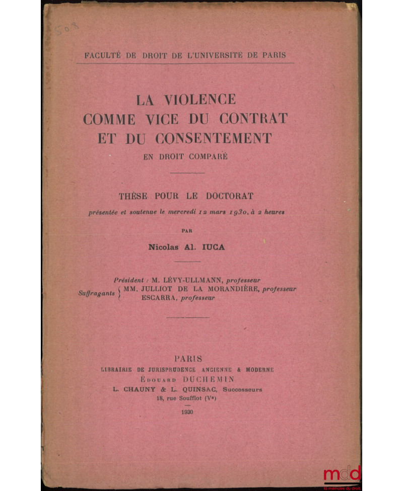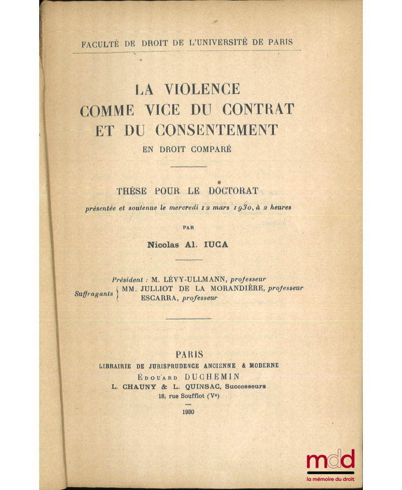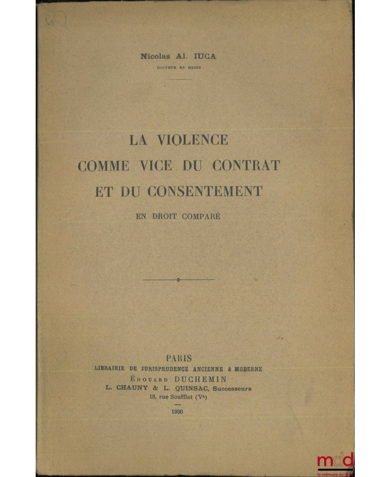Quick view Add to cart Add to wishlist Add to compare Droit moderne (XX-XXIe siècles) IUCA (Nicolas Al.) LA VIOLENCE COMME VICE DU CONTRAT ET DU CONSENTEMENT en droit comparé, , Thèse (Président : M. Lévy-Ullmann ; Suffragants : M... Price LA VIOLENCE COMME VICE DU CONTRAT ET DU CONSENTEMENT en droit comparé, , Thèse (Président : M. Lévy-Ullmann ; Suffragants : MM. Julliot de la...