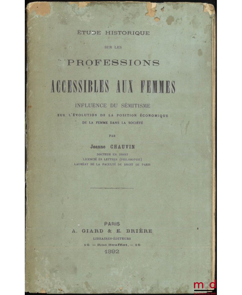 ÉTUDE HISTORIQUE SUR LES PROFESSIONS ACCESSIBLES AUX FEMMES, INFLUENCE DU SÉMITISME SUR L?ÉVOLUTION DE LA POSITION ÉCONOMIQUE...