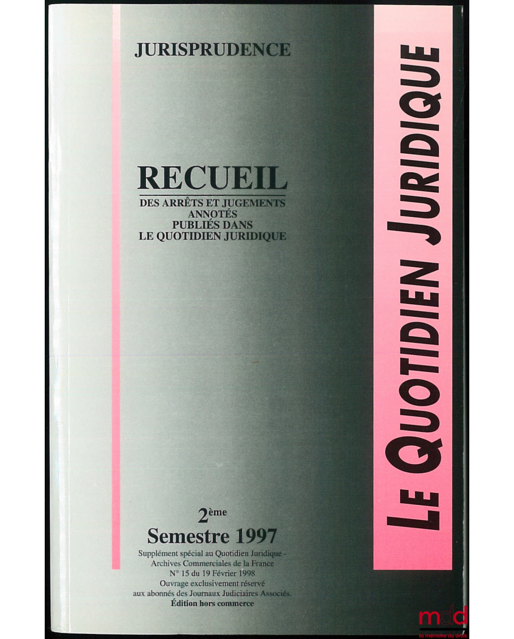 LE QUOTIDIEN JURIDIQUE, JURISPRUDENCE, Recueil des arrêts et jugements annotés publiés dans le Quotidien juridique, 2e semestre 1997, éd. hors commerce