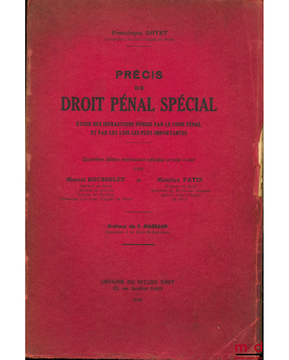 PRÉCIS DE DROIT PÉNAL SPÉCIAL, ÉTUDE DES INFRACTIONS PUNIES PAR LE CODE PÉNAL ET PAR LES LOIS LES PLUS IMPORTANTES, Préface de F. Mazeaud, 4ème éd. entièrement refondue et mise à jour par Marcel Rousselet et Maurice Patin