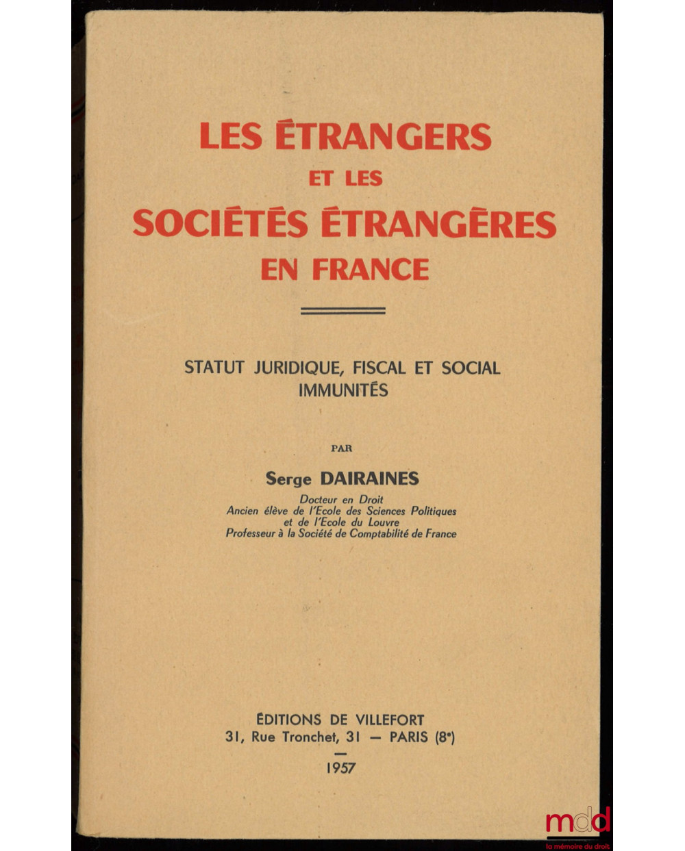 LES ÉTRANGERS ET LES SOCIÉTÉS ÉTRANGÈRES EN FRANCE, STATUT JURIDIQUE, FISCAL ET SOCIAL, IMMUNITÉS