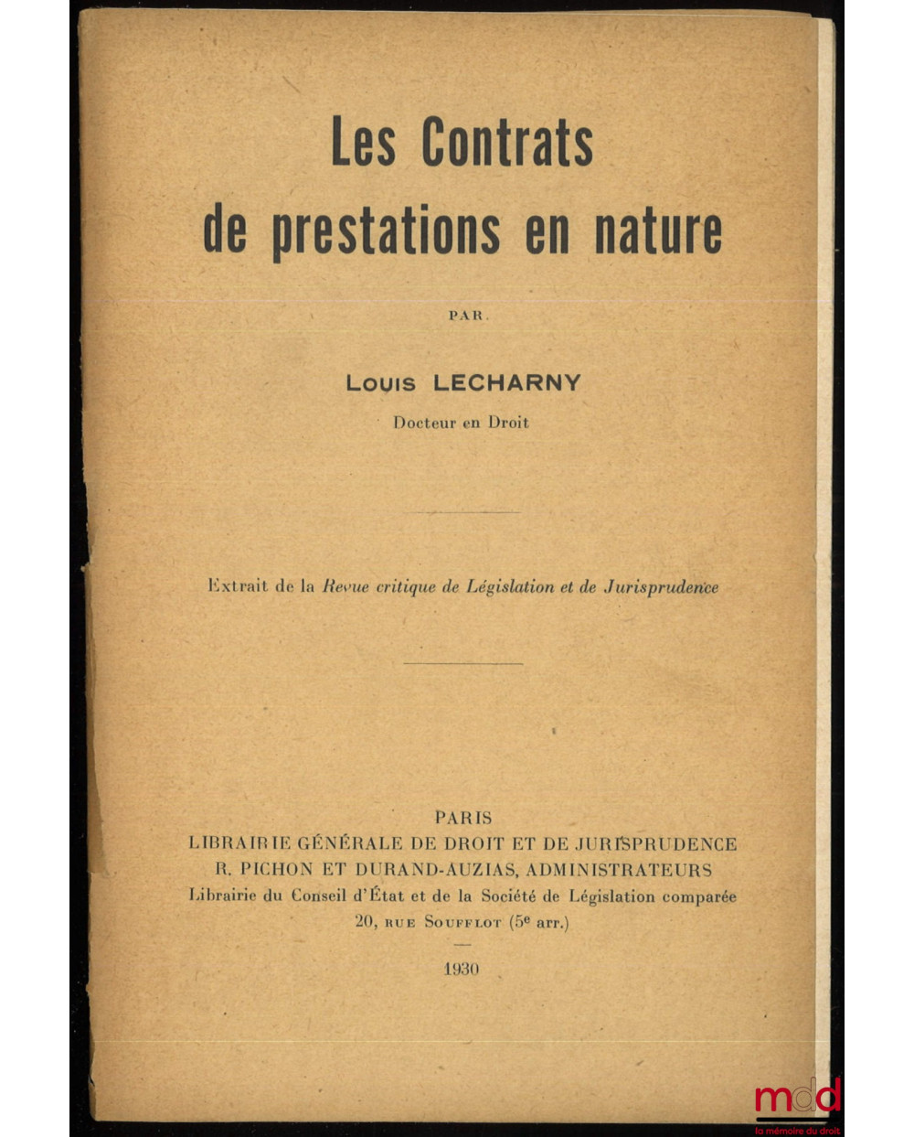 LES CONTRATS DE PRESTATIONS EN NATURE. Extrait de la Revue critique de Législation et de Jurisprudence