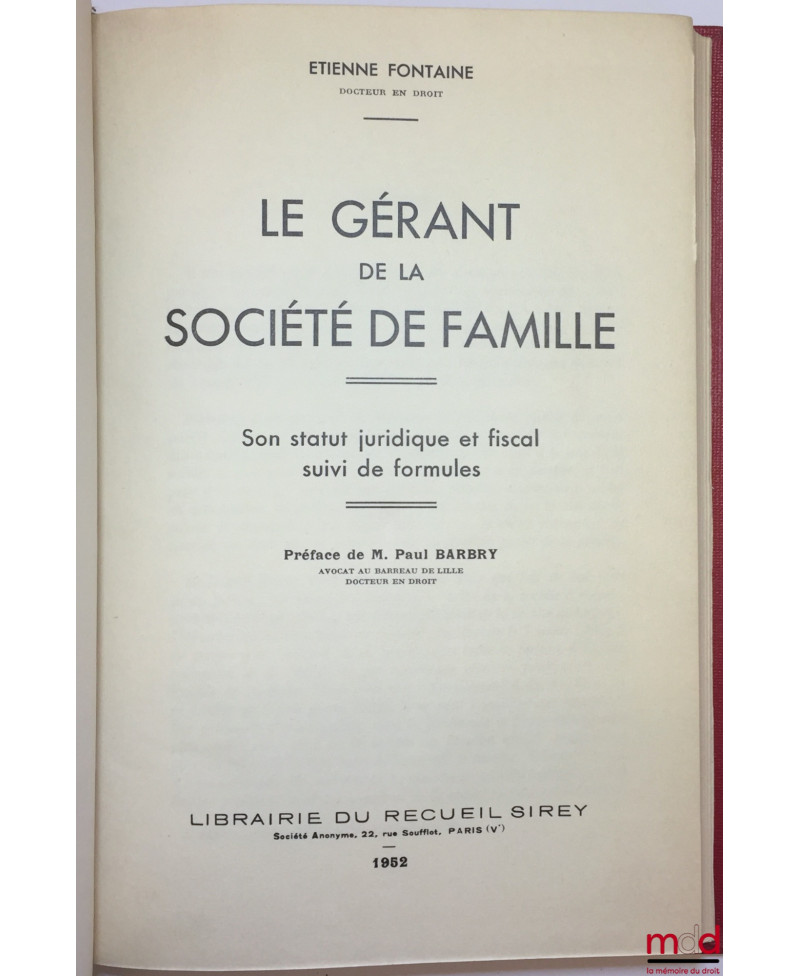 LE GÉRANT DE LA SOCIÉTÉ DE FAMILLE, Son statut juridique et fiscal suivi de formules, Préface de M. Paul Barbry