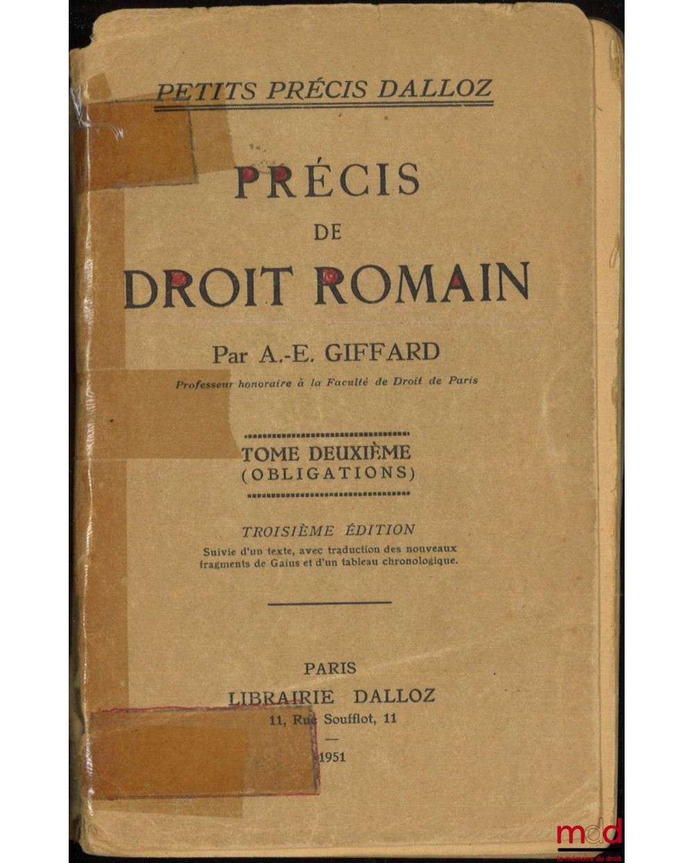 PRÉCIS DE DROIT ROMAIN, t. II : (Obligations), 3e éd. suivie d’un texte avec traduction des nouveaux fragments de Gaius et d’un tableau chronologique, [manque t. I]