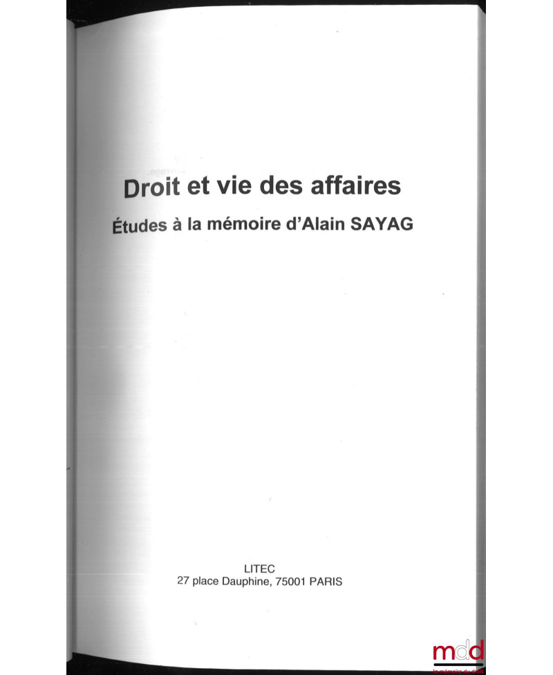 DROIT ET VIE DES AFFAIRES, Études à la mémoire d’Alain Sayag, Préface de Jean-Denis Bredin, postface de Jean Carbonnier, coll. Droit des affaires, Études du Centre de recherche sur le droit des affaires CCI Paris