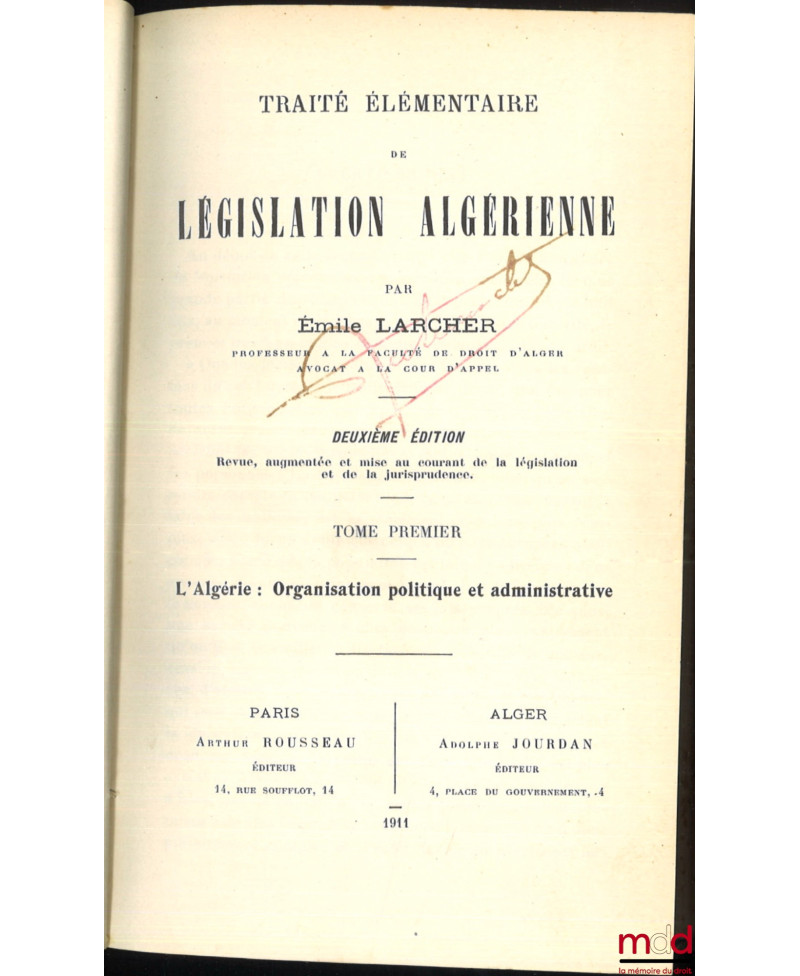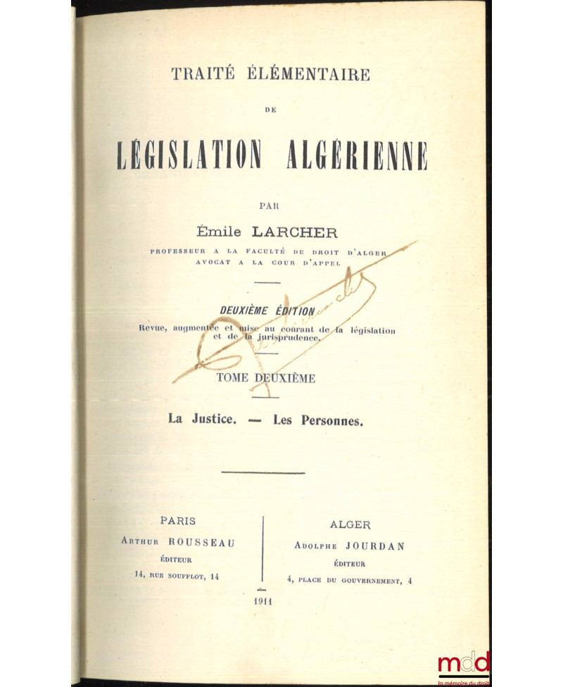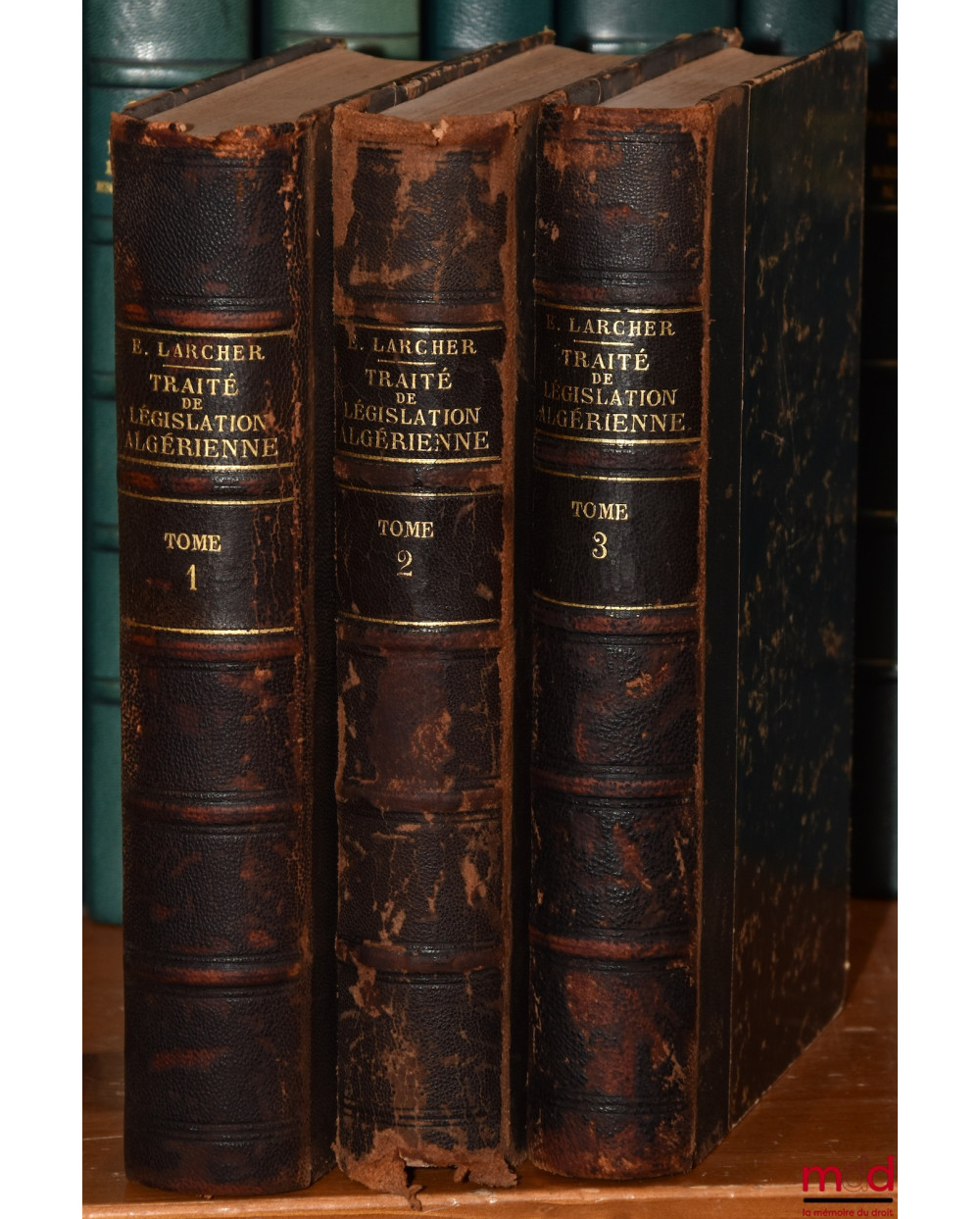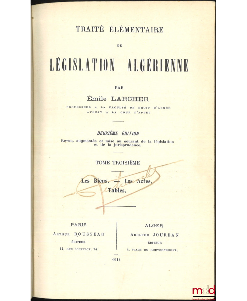 TRAITÉ ÉLÉMENTAIRE DE LÉGISLATION ALGÉRIENNE, 2e éd. revue, augmentée et mise au courant de la législation et de la jurisprudence : - t. I : L’Algérie : Organisation politique et administrative- t. II : La Justice. - Les Personnes.- t. III : Les Biens. - Les Actes. Tables.