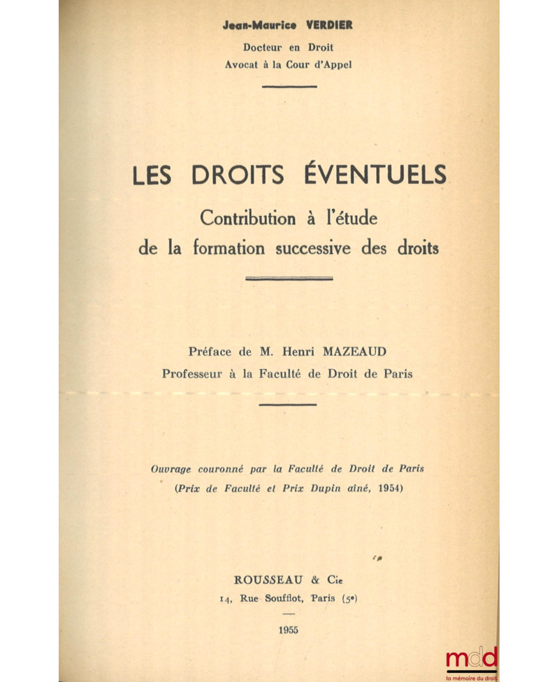 LES DROITS ÉVENTUELS, Contribution l’étude de la formation successive des Droits, Préface de Henri Mazeaud