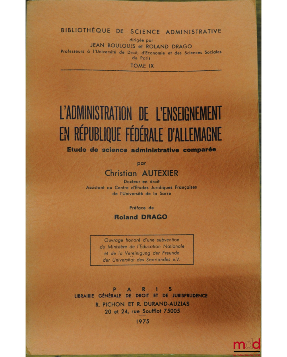 L’ADMINISTRATION DE L’ENSEIGNEMENT EN RÉPUBLIQUE FÉDÉRALE D’ALLEMAGNE, Étude de science administrative comparée, Bibl. de science administrative, t. IX