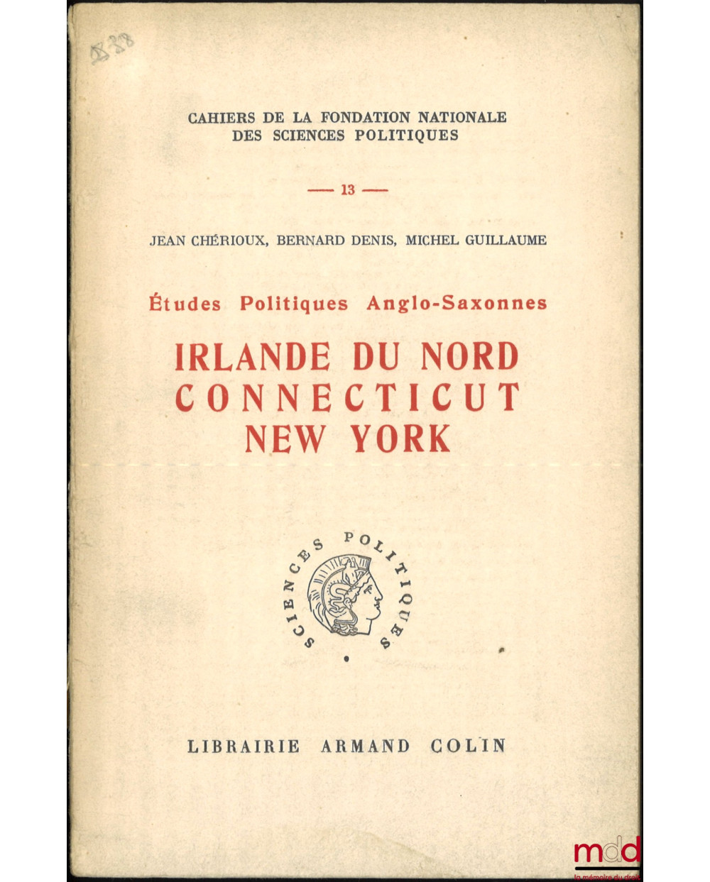 ÉTUDES POLITIQUES ANGLO-SAXONNES, IRLANDE DU NORD CONNECTICUT NEW YORK, Avant-propos de Jacques Chapsal, Préface de Henry Puget, Cahiers de la Fondation nationale des Sciences politiques, n° 13