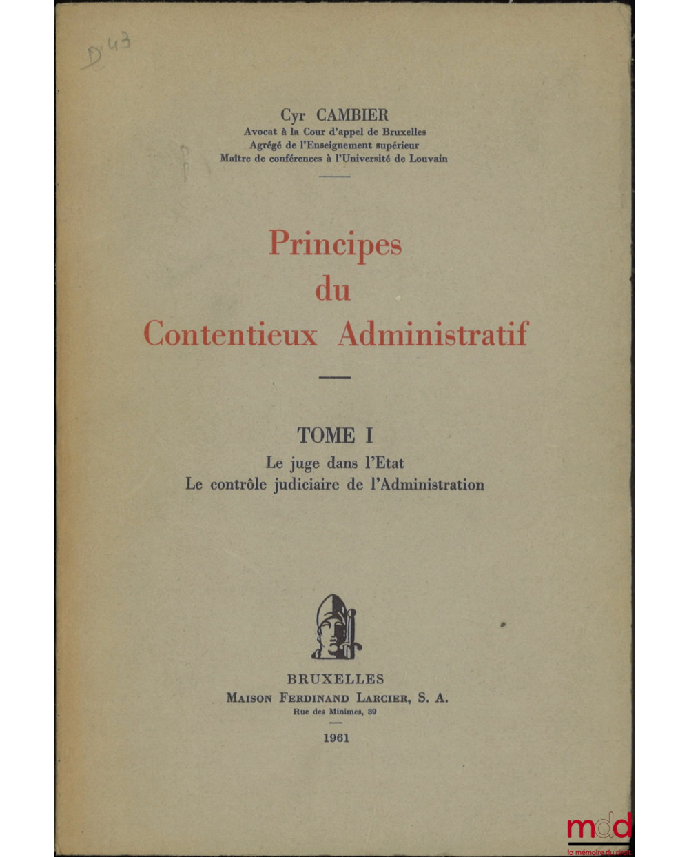 PRINCIPES DU CONTENTIEUX ADMINISTRATIF, t. I : Le juge dans l’État, Le contrôle judiciaire de l’administration [mq. le t. II]