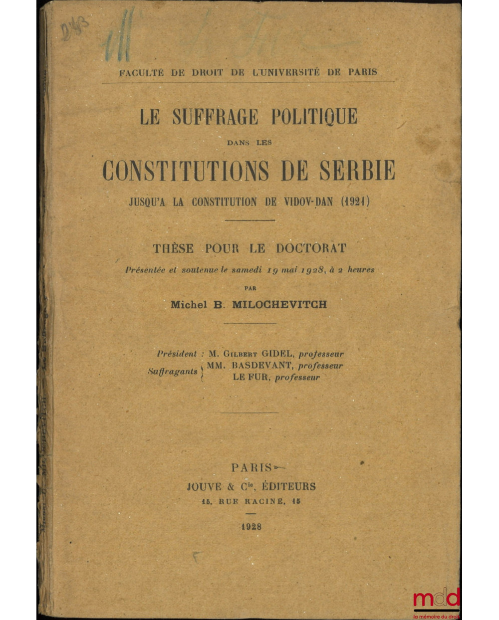 LE SUFFRAGE POLITIQUE DANS LES CONSTITUTIONS DE SERBIE, Jusqu’à la constitution de Vidov-Dan (1921), Thèse (Président : Gilbert Gidel ; Suffragants : MM. Basdevant et Le Fur), Faculté de droit de l’Université de Paris