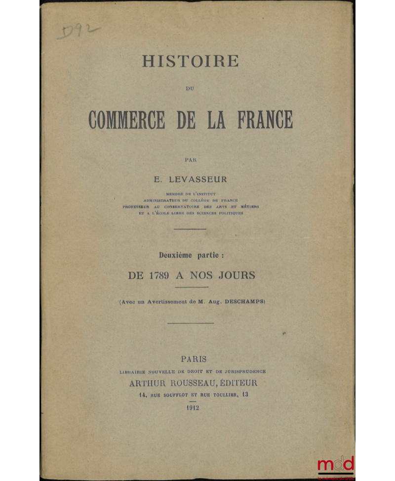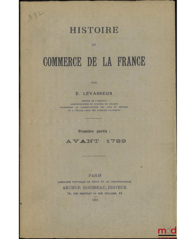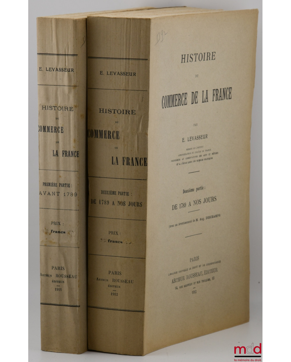 HISTOIRE DU COMMERCE DE LA FRANCE, Première partie : Avant 1789, Deuxième partie : De 1789 à nos jours (Avec un avertissement de Aug. Deschamps)