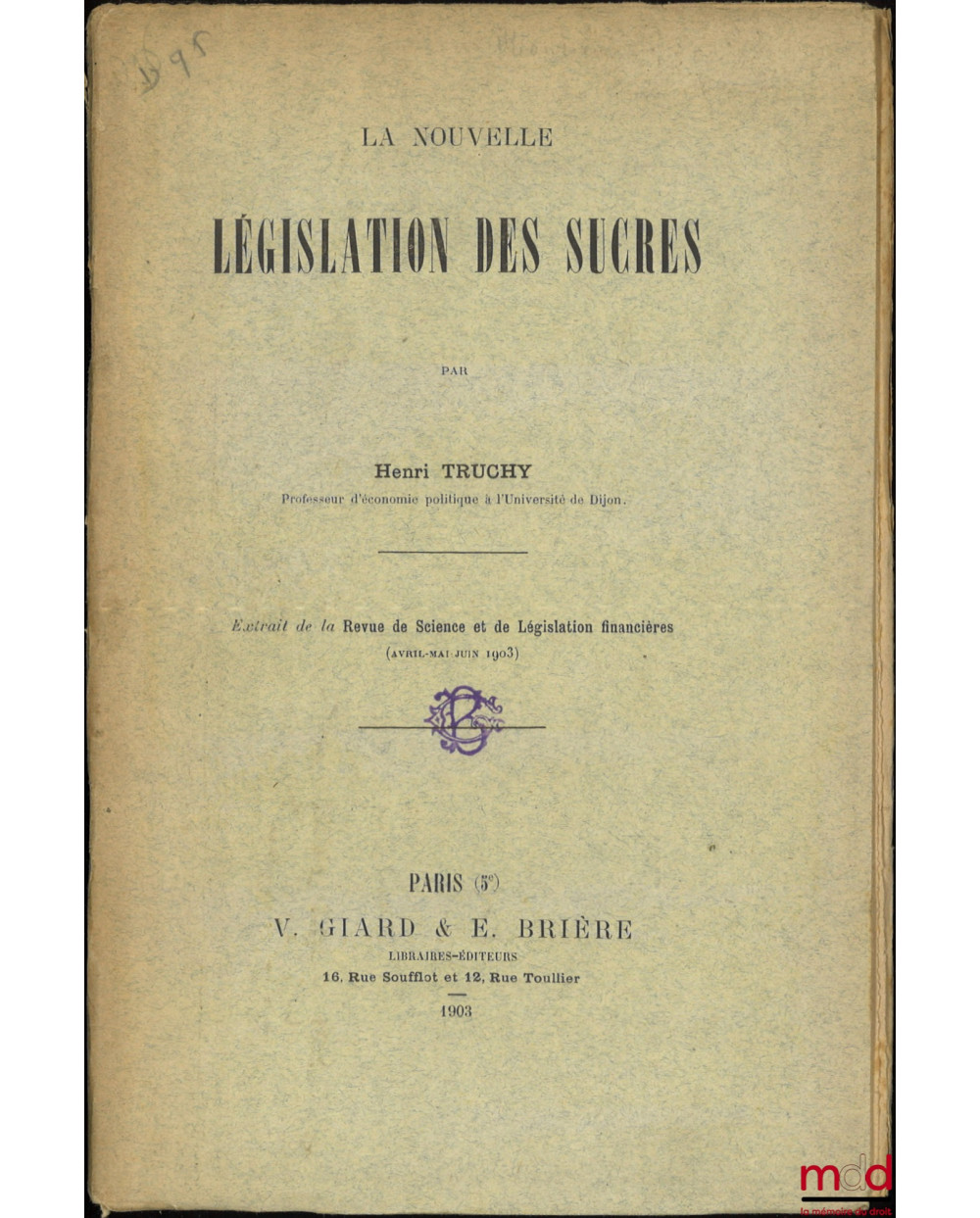 LA NOUVELLE LÉGISLATION DES SUCRES, Extrait de la Revue de Science et de Législation financières (Avril-Mai-Juin 1903)