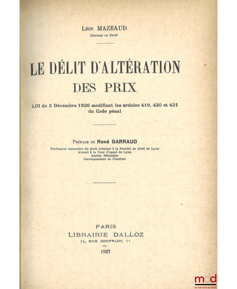 LE DÉLIT D’ALTÉRATION DES PRIX, Loi du 3 décembre 1926 modifiant les articles 419, 420 et 421 du Code pénal, Préface de René Garraud