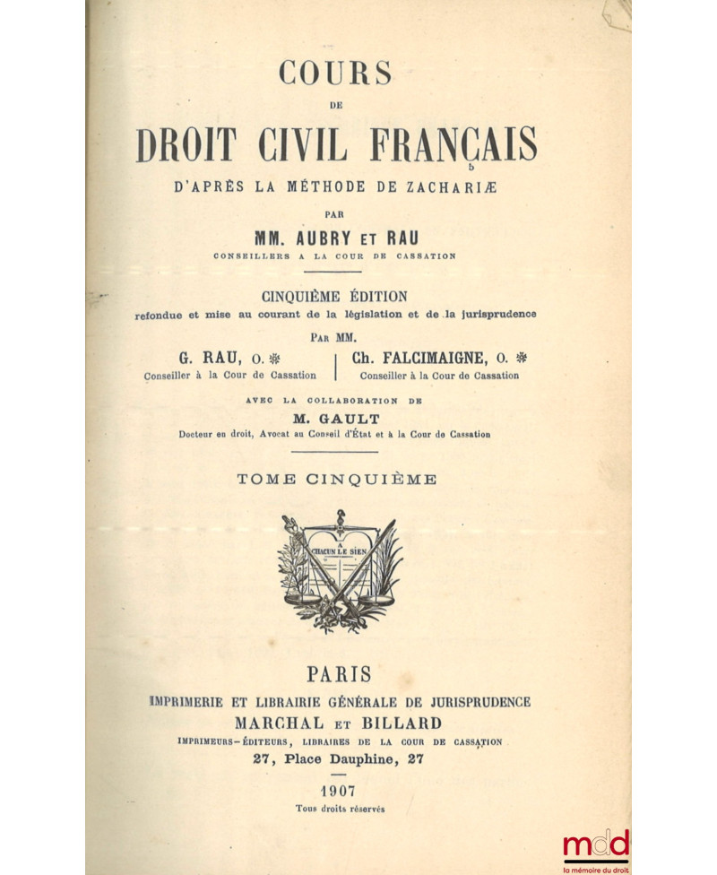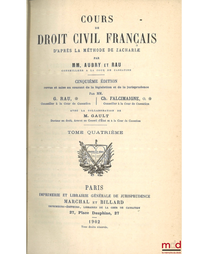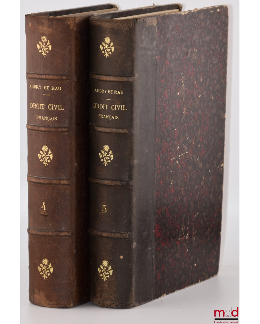 COURS DE DROIT CIVIL FRANÇAIS D’APRÈS LA MÉTHODE DE ZACHARIÆ, 5e éd. revue et mise au courant de la législation et de la jurisprudence par G. Rau et Ch. Falcimaigne avec la collaboration de M. Gault, [t. IV et V uniquement]