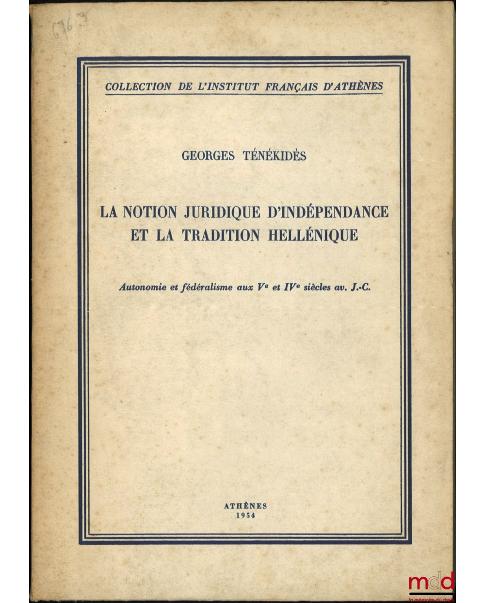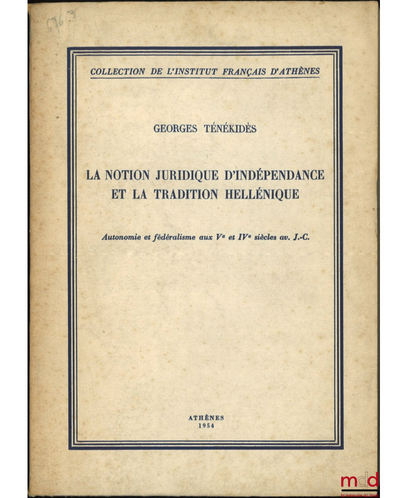 LA NOTION JURIDIQUE D’INDÉPENDANCE ET LA TRADITION HELLÉNIQUE, Autonomie et Fédéralisme aux Ve et IVe siècles av. J.-C., coll. de l’Institut Français d’Athènes