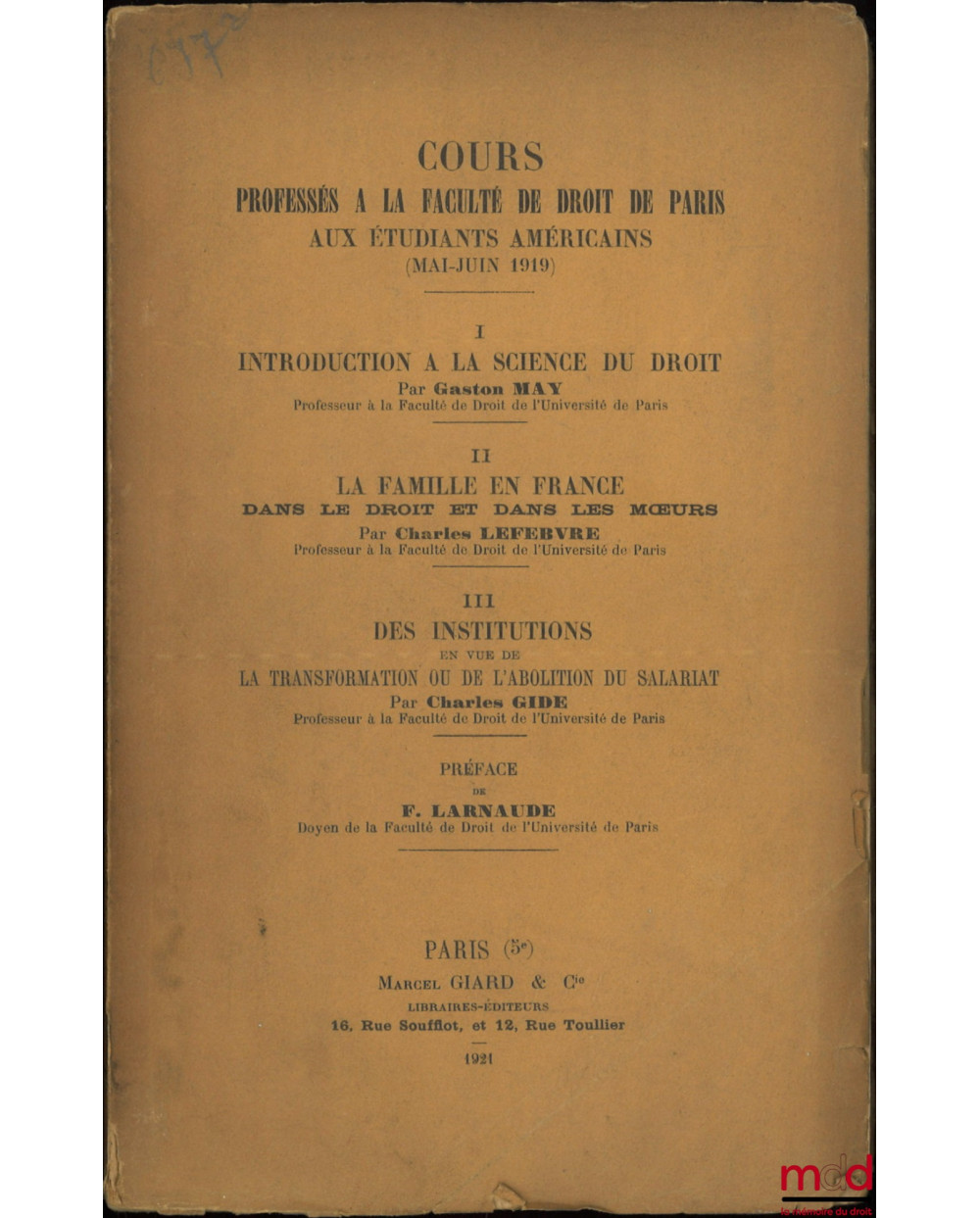 Cours professés à la Faculté de droit de Paris aux étudiants américains (mai-juin 1919), Préface de Ferdinan Larnaude :I – G. May, INTRODUCTION À LA SCIENCE DU DROIT ;II – C. Lefbvre, LA FAMILLE EN FRANCE dans le droit et dans les moeurs ;III – C. Gide, DES INSTITUTIONS en vue de LA TRANSFORMATION OU DE L’ABOLITION DU SALARIAT