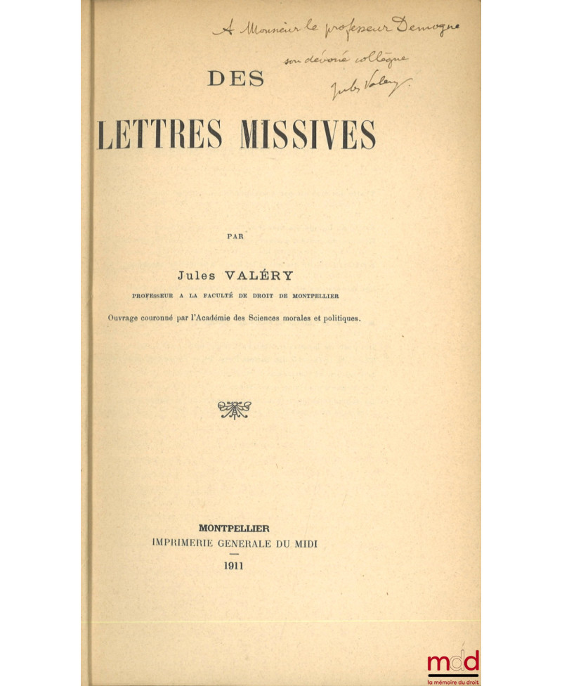 Description : in-8, br., non coupé, ENVOI AU PROFESSEUR DEMOGUE, (couv. muette), 420 p.