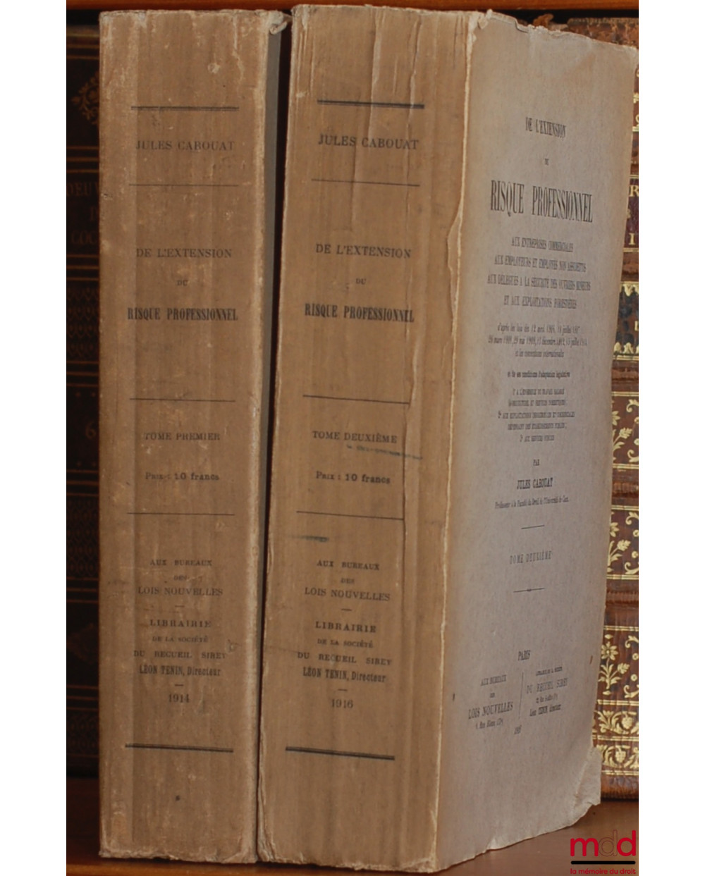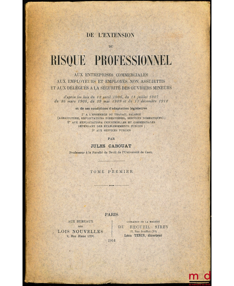 DE L’EXTENSION DU RISQUE PROFESSIONNEL aux entreprises commerciales, aux employeurs et employés non assujettis et aux délégués à la sécurité des ouvriers mineurs d’après les lois du 12 avril 1906, du 18 juillet 1907, du 26 mars 1908, du 29 mai 1909 et du 13 décembre 1912 et ses conditions d’adaptation législative : 1° À l’ensemble du travail salarié (agriculture, exploitations forestières, services domestiques) ; 2° Aux exploitations industrielles et commerciales dépendant des établissements publics ; 3° Aux services publics