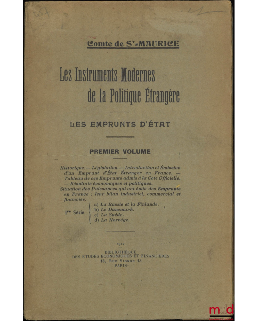 LES INSTRUMENTS MODERNES DE LA POLITIQUE ÉTRANGÈRE, Les emprunts d’État, Premier volume : Historique. - Législation. - Introduction et Émission d’un Emprunt d’État Étranger en France. - Tableau de ces Emprunts admis à la Cote Officielle. - Résultats économiques et politiques. - Situation des puissances qui ont émis des Emprunts en France : leur bilan industriel, commercial et financier. ; 1re série : a) La Russie et la Finlande. b) Le Danemark. c) La Suède. d) La Norvège., [mq. t. II]
