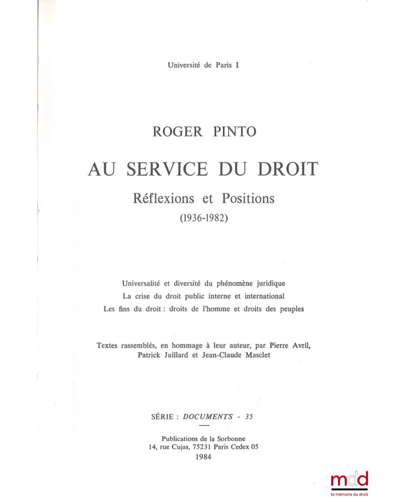 ROGER PINTO, AU SERVICE DU DROIT. Réflexions et Positions (1936-1982). Universalité et diversité du phénomène juridique – La crise du droit public interne et international – Les fins du droit : droits de l’homme et droits des peuples. Textes rassemblés, en hommage à leur auteur, par Pierre Avril, Patrick Juillard et Jean-Claude Masclet, Univ. Paris I, Série : Documents - 35