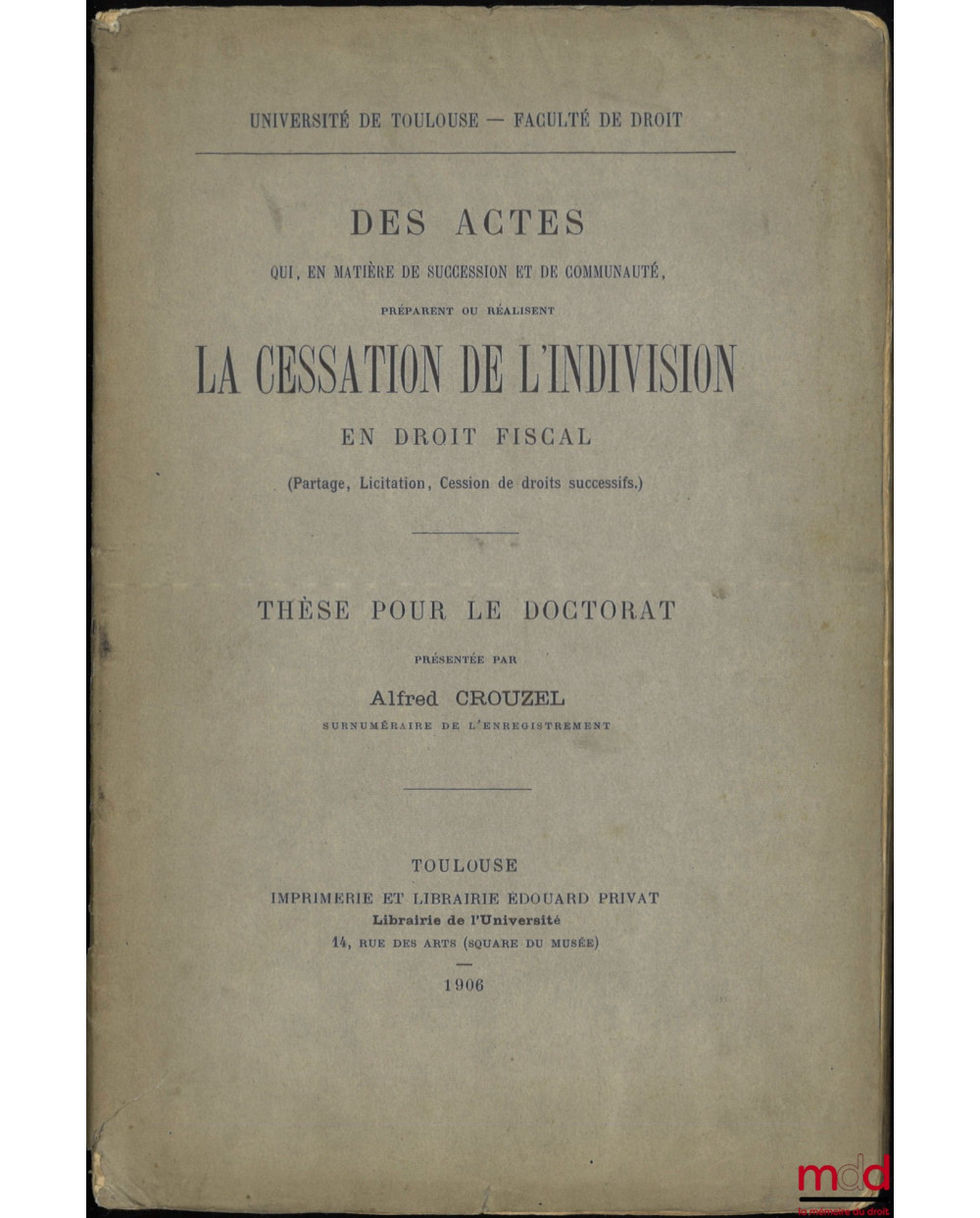 DES ACTES QUI, EN MATIÈRE DE SUCCESSION ET DE COMMUNAUTÉ, PRÉPARENT OU RÉALISENT LA CESSATION DE L’INDIVISION EN DROIT FISCAL, (Partage, Licitation, Cession de droits successifs), Thèse, Université de Toulouse - Faculté de droit