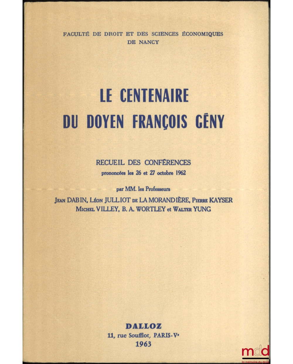 LE CENTENAIRE DU DOYEN FRANÇOIS GÉNY, Recueil des conférences prononcées les 26 et 27 octobre 1962 par MM. les Professeurs Jean Dabin, Léon Julliot de La Morandière, Pierre Kayser, Michel Villey, B. A. Wortley et Walter Yung, Faculté de droit et des sciences économiques de Nancy