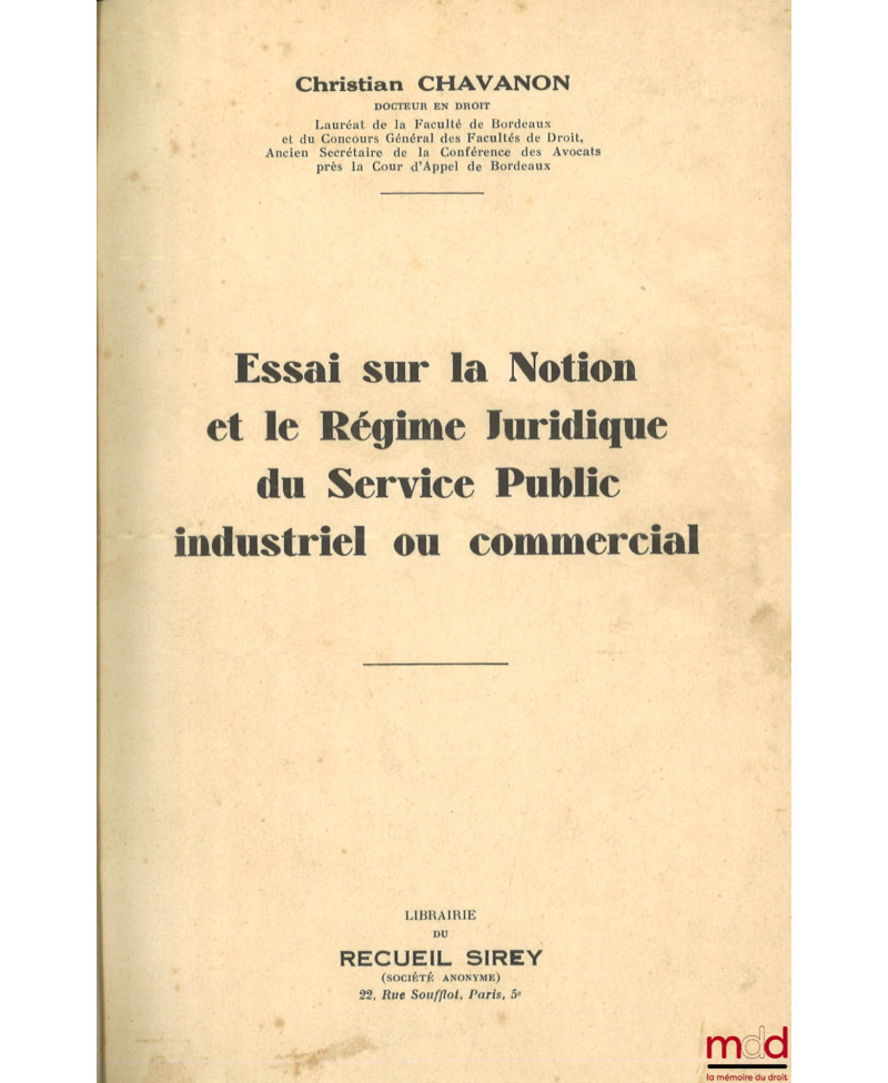ESSAI SUR LA NOTION ET LE RÉGIME JURIDIQUE DU SERVICE PUBLIC INDUSTRIEL OU COMMERCIAL