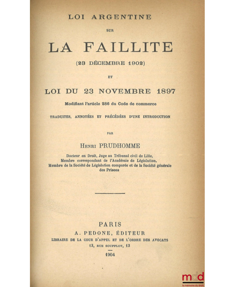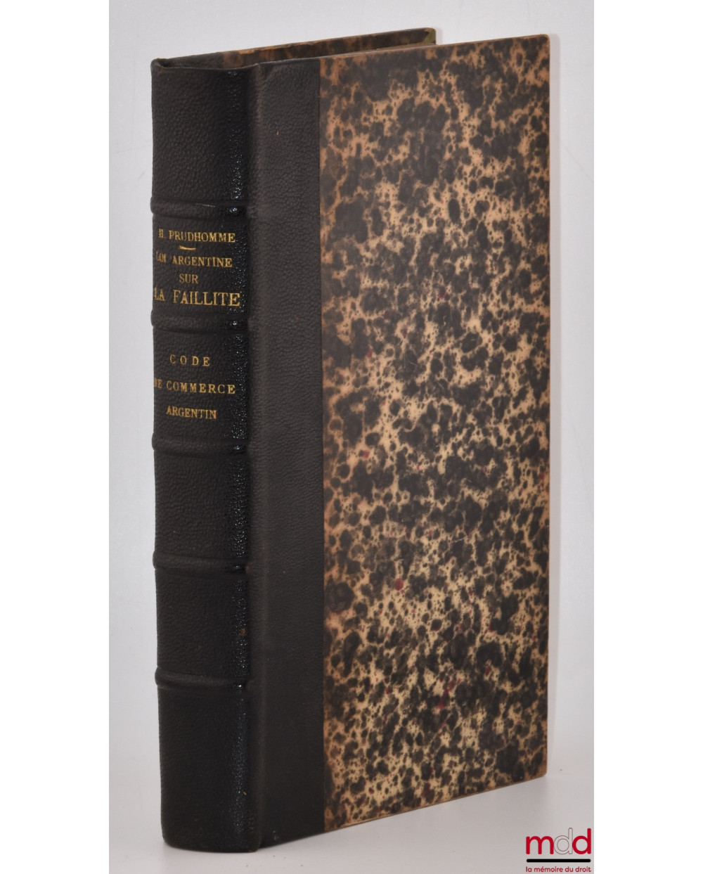 LOI ARGENTINE SUR LA FAILLITE (23 décembre 1902) et LOI DU 23 NOVEMBRE 1897 modifiant l’article 286 du Code de commerce, Traduites, annotées et précédées d’une introduction par Henri Prudhomme, coll. de codes étrangers, t. VI bis ;CODE DE COMMERCE ARGENTIN promulgué le 9 octobre 1889, Mis en vigueur le 1er mai 1890, Traduit, annoté et précédé d’une introdution par Henri Prudhomme