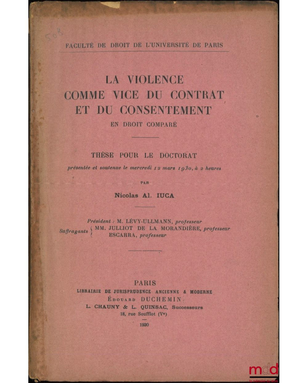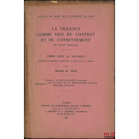 LA VIOLENCE COMME VICE DU CONTRAT ET DU CONSENTEMENT en droit comparé, Thèse (Président : M. Lévy-Ullmann ; Suffragants : MM. Julliot de la Morandière, Escarra)