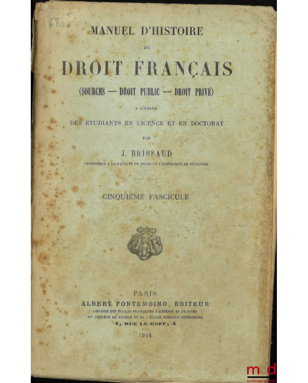 Il s’agit ici du grand traité d’histoire du droit public et privé de l’auteur dont la dernière partie, l’histoire du droit privé, qui est en réalité connu sous le titre plus courant de Manuel d’histoire du droit privé, publié de manière séparée. Il demeure aujourd’hui encore une des sources bibliographiques les plus importantes (voir par ex. Patault, Introduction Historique au Droit des Biens, P.U.F. 1989). Il est extrêmement précis sur les grandes notions du droit privé. A titre d’exemple le chapitre consacré au droit de propriété et aux droits réels ainsi que celui sur le droit des obligations couvre près de 200 pages chacun. Très rare et recherché…