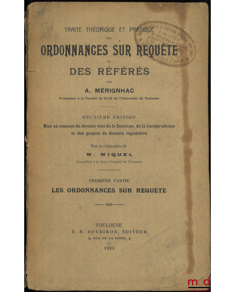 L’auteur, professeur à la faculté de droit de Toulouse, a produit des traités dans l’ensemble des matières du droit (arbitrage international, droit civil, prescription en matière civile et criminelle, droit international public, législation des usages toulousains). Il livre ici une étude du régime des référés dont on peut considérer qu’elle est la plus minutieuse sur la question et qui contient des analyses tout à fait remarquables de l’époque. Rare.