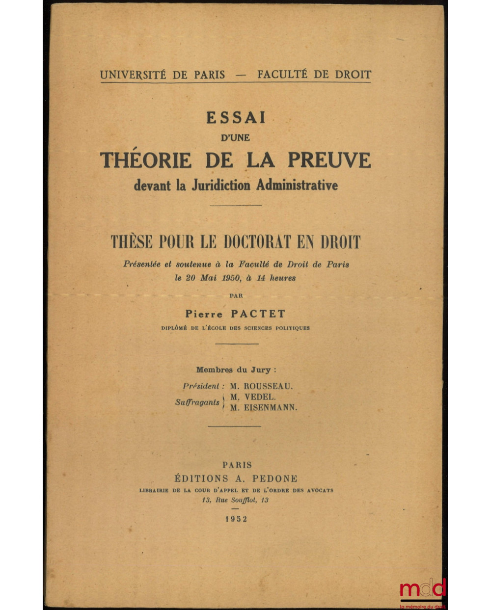 ESSAI D’UNE THÉORIE DE LA PREUVE DEVANT LA JURIDICTION ADMINISTRATIVE, Thèse (Président : M. Rousseau ; Suffragants : Vedel et Eisenmann)
