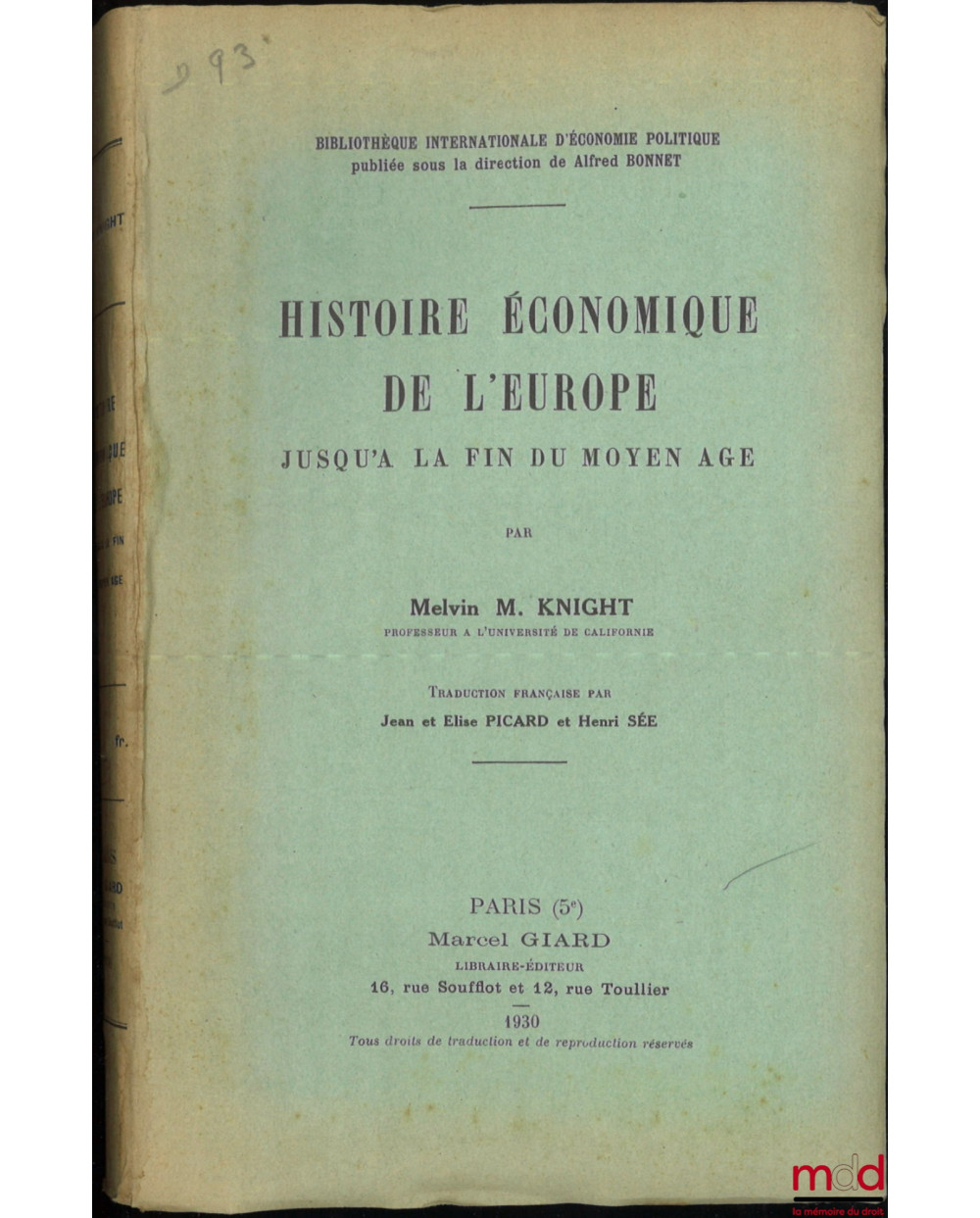 HISTOIRE ÉCONOMIQUE DE L’EUROPE JUSQU’À LA FIN DU MOYEN ÂGE, Traduction française par Jean et Élise Picard et Henri Sée