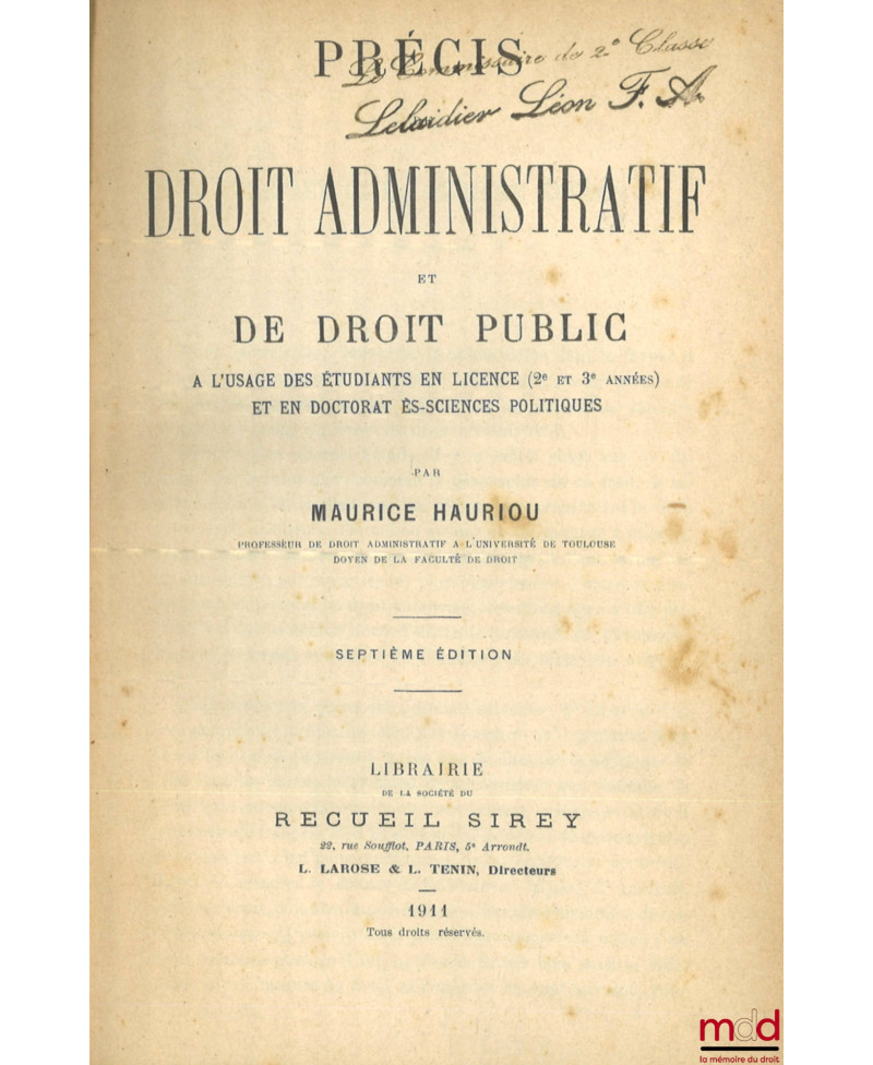 Il s’agit d’un exemplaire de la 7e édition qui, par rapport aux précédentes, se caractérise par le fait que pour la première fois Hauriou applique sa théorie de l’institution aux organisations administratives. Les éditions ultérieures porteront moins l’accent sur cet aspect.