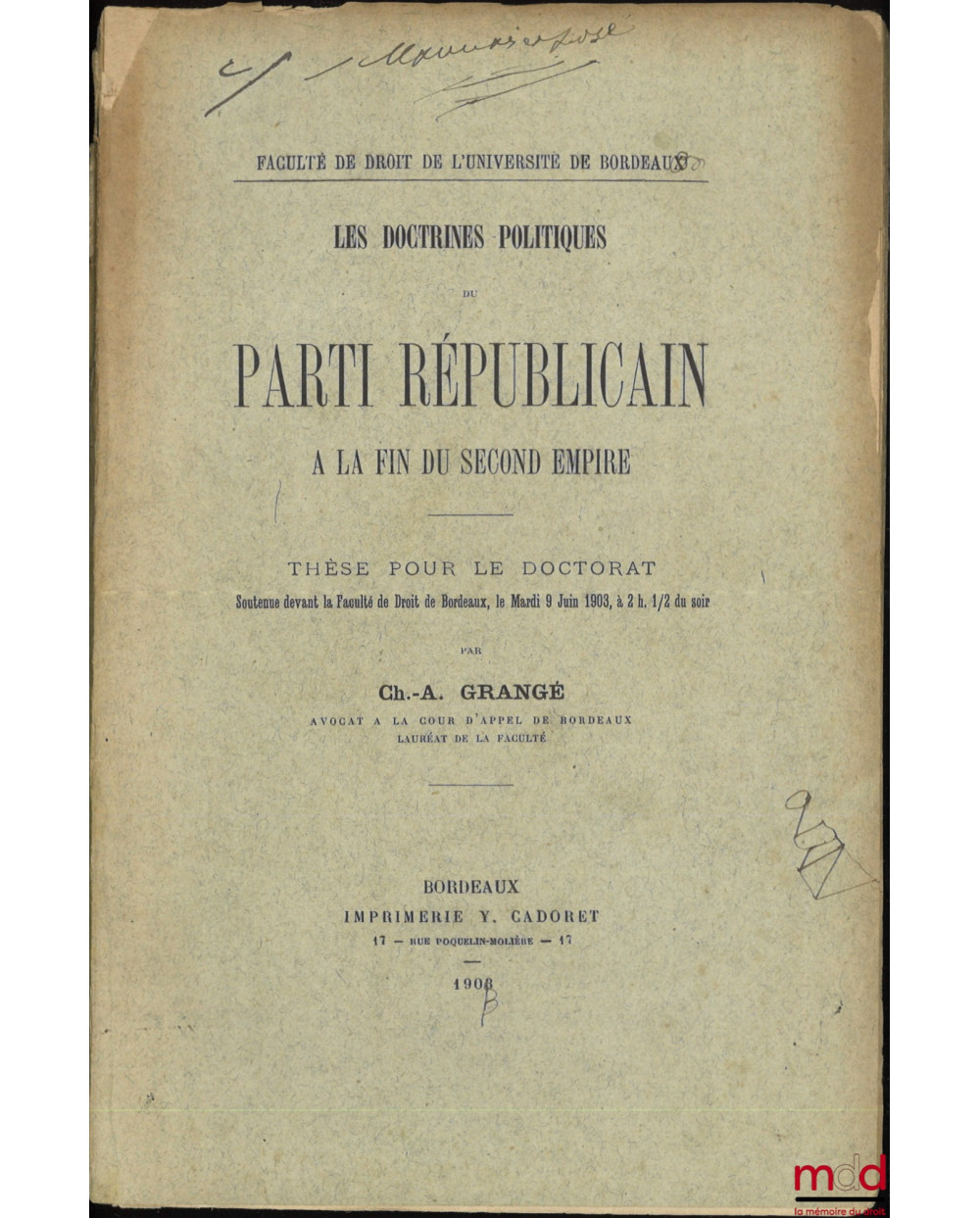 LES DOCTRINES POLITIQUES DU PARTI RÉPUBLICAIN À LA FIN DU SECOND EMPIRE, Thèse, Faculté de droit de l’Université de Bordeaux