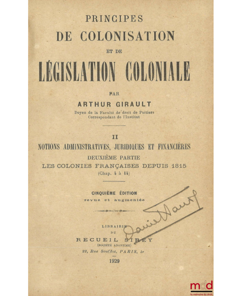 PRINCIPES DE COLONISATION ET DE LÉGISLATION COLONIALE, II. Notions administratives, juridiques, et financières, Deuxième partie : Les colonies françaises depuis 1815 (Chap. 4 à 14), 5e éd. revue et augmentée [mq. le t. I]
